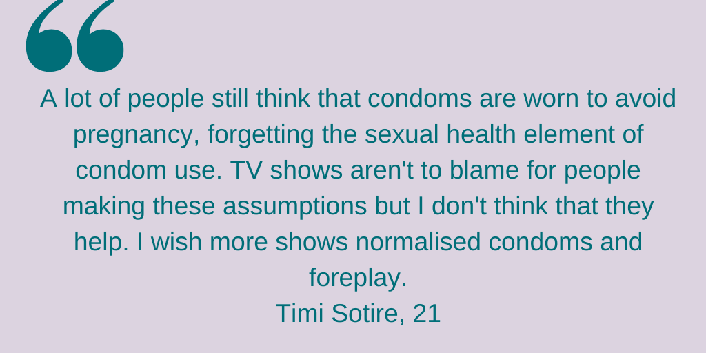 “Whilst it’s dangerous to assume that audiences have a straightforward “monkey see, monkey do” reaction to what they see (or don’t see) on screen, I don’t think we should underestimate the power of TV shows and movies to start important discussions about sex and sexuality, and to help normalise more positive and safer behaviours when it comes to matters such as consent and contraception,” says Alix.