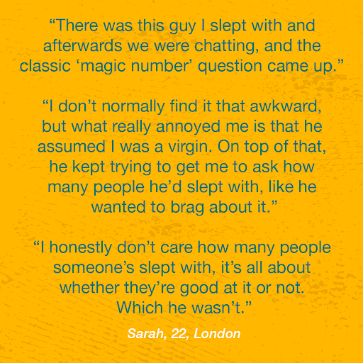 If you think they have a problem with how many people you’ve slept with (whether they think it’s too many or not enough), ask them why. Their answer may just be down to their own insecurities, or it could make you realise they’re not the right person for you.